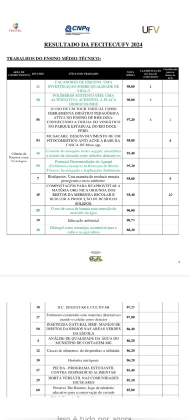 DA REDAÇÃO – A Escola Estadual Padre Dionísio Homem de Faria (EEPDHF), em Bom Jesus do Galho, se destacou na 10º FECITEC – Feira de Ciência, Tecnologia e Inovação, realizada no campus Florestal da Universidade Federal de Viçosa (UFV), no final de outubro. Com a participação de 120 projetos pré-selecionados, a escola conquistou o terceiro e o quinto lugares na classificação geral, além de receber dois importantes prêmios: bolsas de iniciação científica do CNPq, que serão de grande valor para o avanço das pesquisas dos alunos.