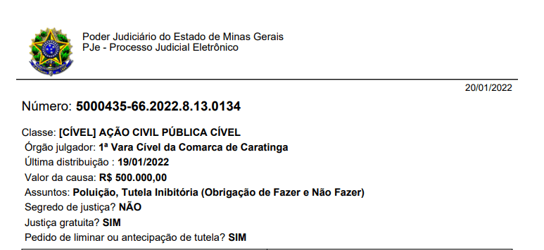 A ação tramita na 1ª Vara Cível da Comarca de Caratinga e tem o valor da causa de R$ 500 mil referentes a danos morais coletivos aos cidadãos do município de Bom Jesus do Galho.