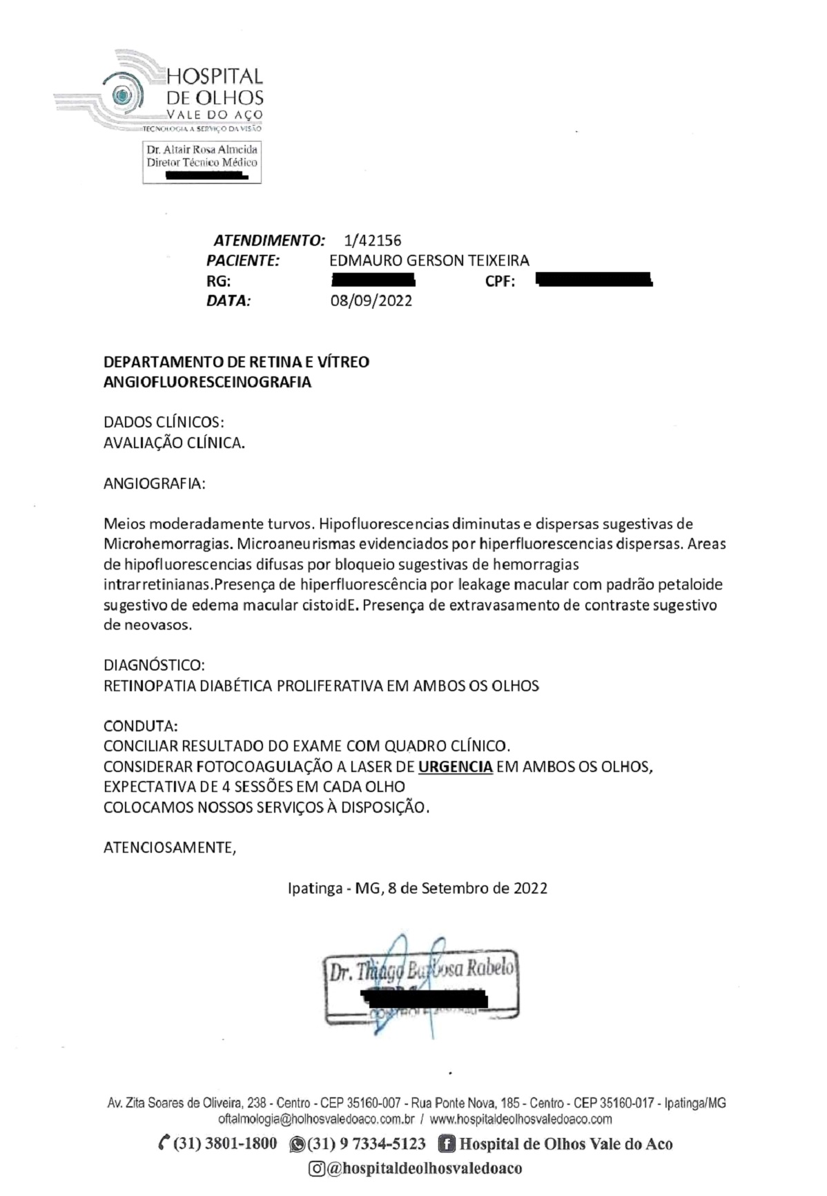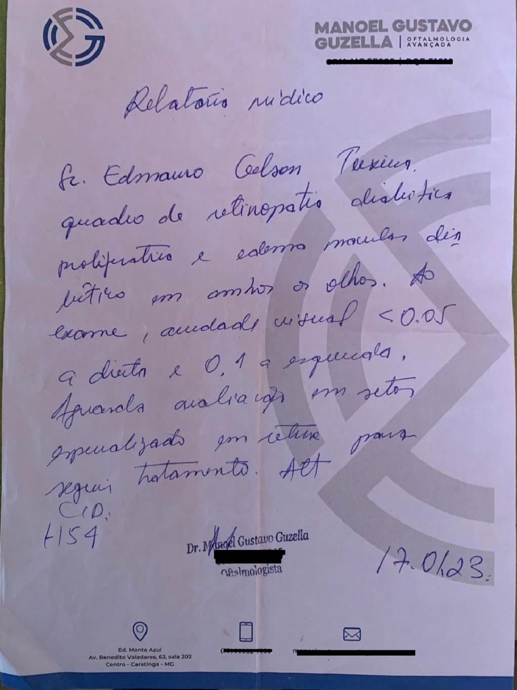 Diagnosticado com retinopatia diabética proliferativa em ambos os olhos, uma luta contra o tempo. Para a doença, que causa perda visual gradativa e pode levar à cegueira, a recomendação conforme laudo médico apresentado foi da realização de uma cirurgia, a fotocoagulação a laser.