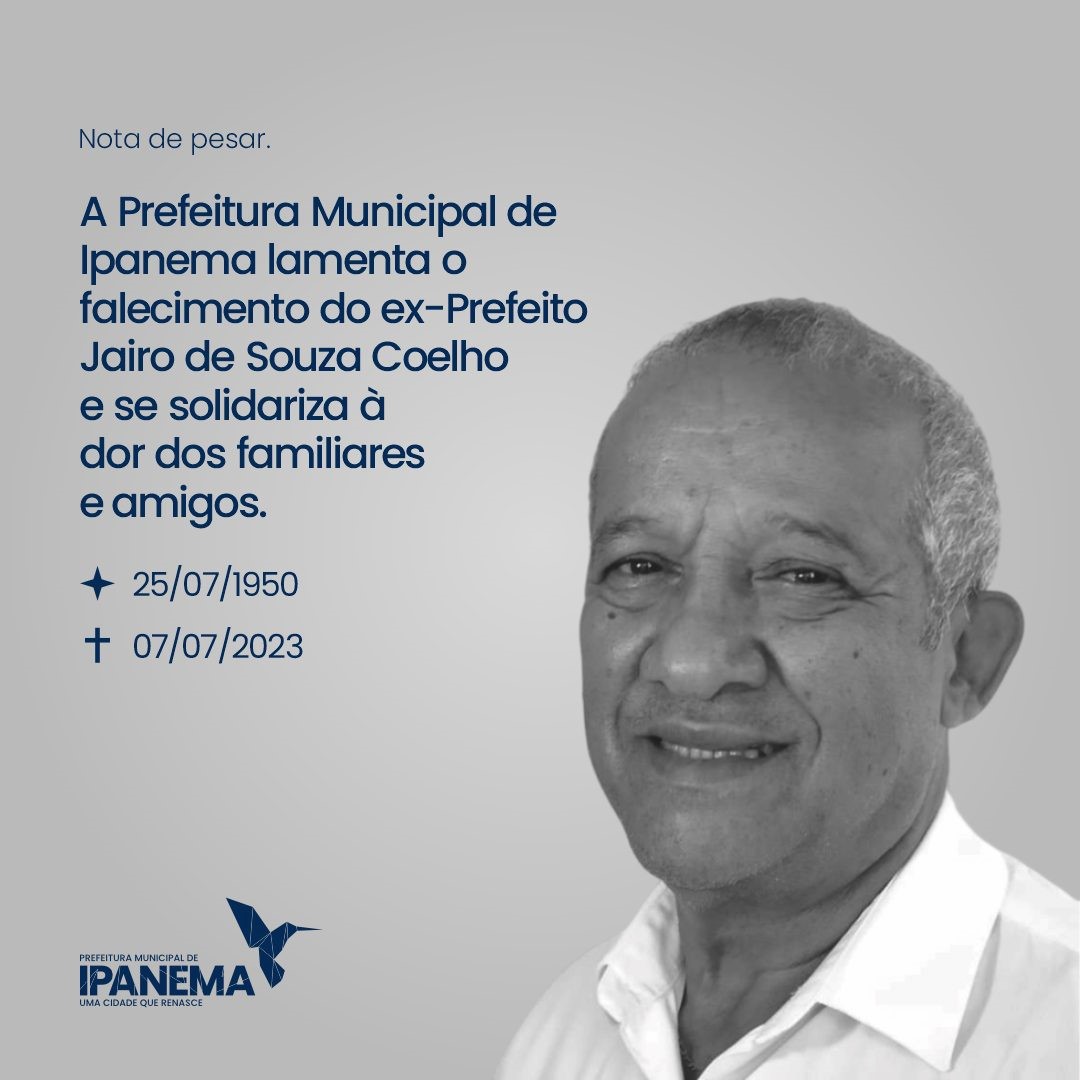 A Prefeitura de Ipanema decretou luto oficial por três dias pelo falecimento do ex-prefeito Jairo de Souza Coelho, conforme o Decreto n° 437.