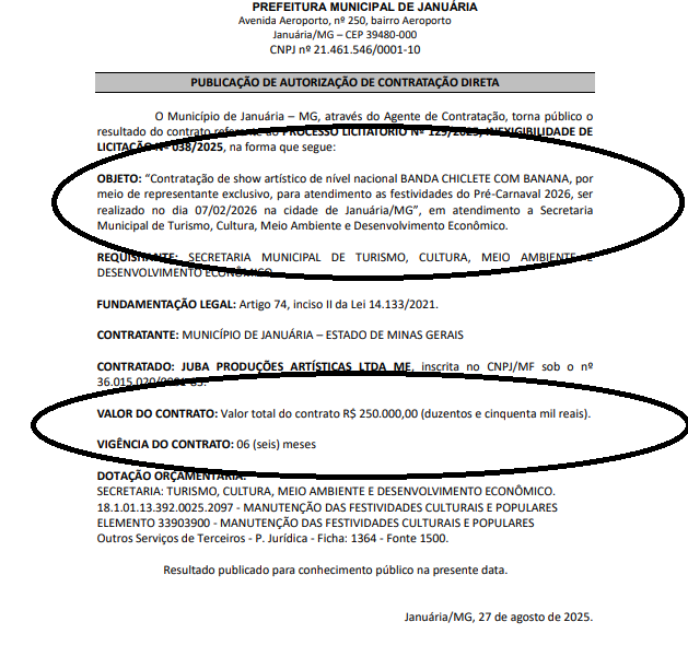 Januária – contrato assinado em agosto/2025: R$ 250.000,00. Show foi no dia 7 de fevereiro de 2026