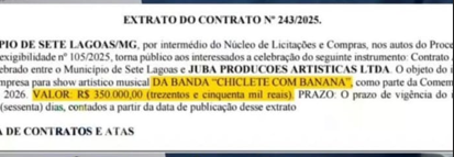 Sete Lagoas – contrato assinado em agosto/2025: R$ 350.000,00 – show foi no dia 8 de fevereiro de 2026.