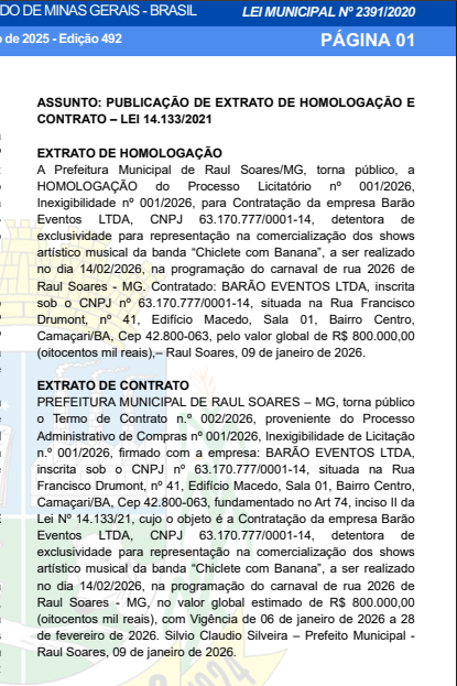 RAUL SOARES – Os valores previstos para a realização do Carnaval 2026 em Raul Soares têm gerado questionamentos por parte de moradores do município. Embora reconheçam a importância cultural, social e econômica da festa, cidadãos entraram em contato com a reportagem para pedir esclarecimentos sobre os gastos anunciados, especialmente em relação ao cachê artístico e à estrutura do evento.