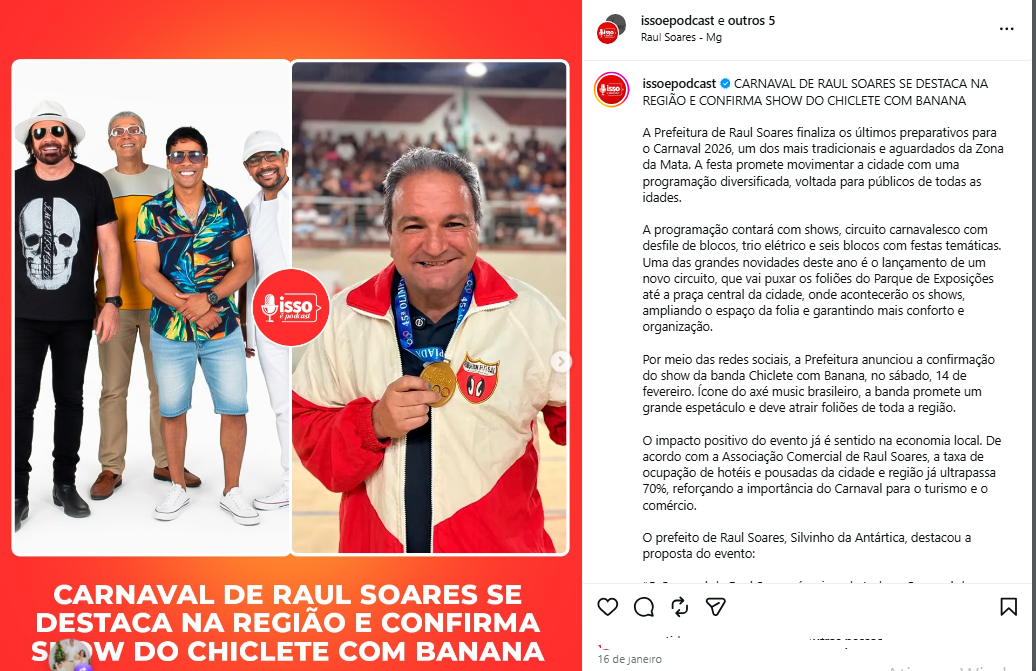 Em janeiro deste ano, quando da confirmação do show do Chiclete com Banana, o prefeito Raul Soares, Silvinho da Antártica, compartilhou, em suas redes sociais, o seguinte texto, mantido na íntegra: