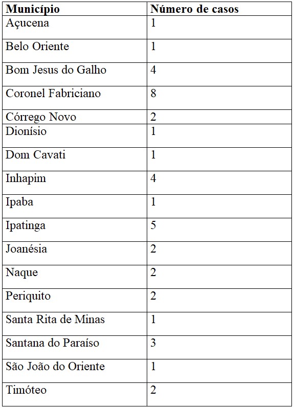 Já no ano de 2023, 41 casos foram registrados na regional de Coronel Fabriciano, destes, em Bom Jesus do Galho (4), Córrego Novo (2), Dom Cavati (1), Inhapim (4) e Santa Rita de Minas (1).