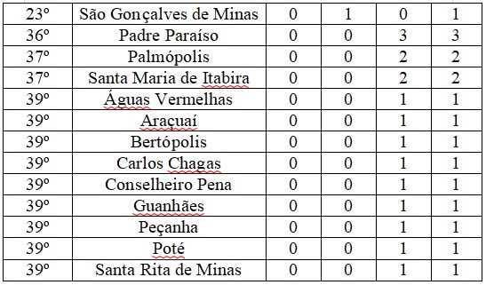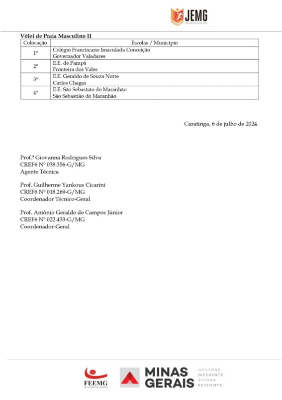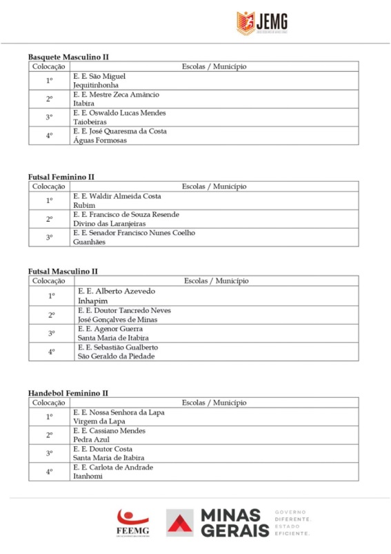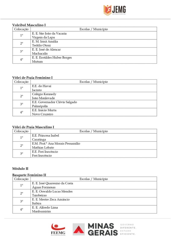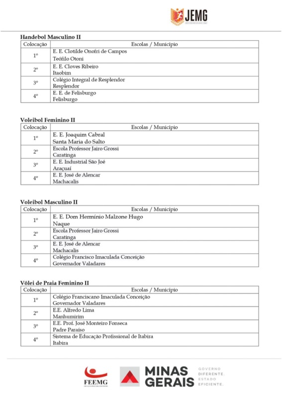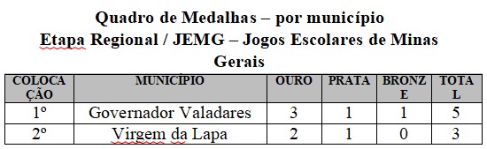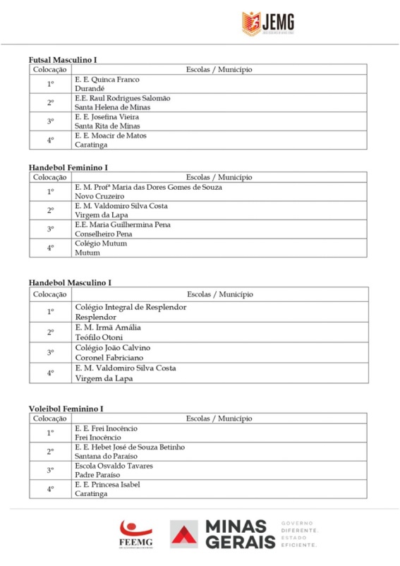 Para a etapa estadual, que acontecerá na cidade de Governador Valadares, entre os dias 5 a 10 de agosto, foram classificados, de Caratinga, a Escola Estadual Princesa Isabel (vôlei de praia masculino e Bruno de Almeida Domingos (xadrez), da Escola Estadual Feliciano Miguel Abdalla. Por Inhapim, a Escola Estadual Alberto Azevedo foi classificada no futsal masculino.
