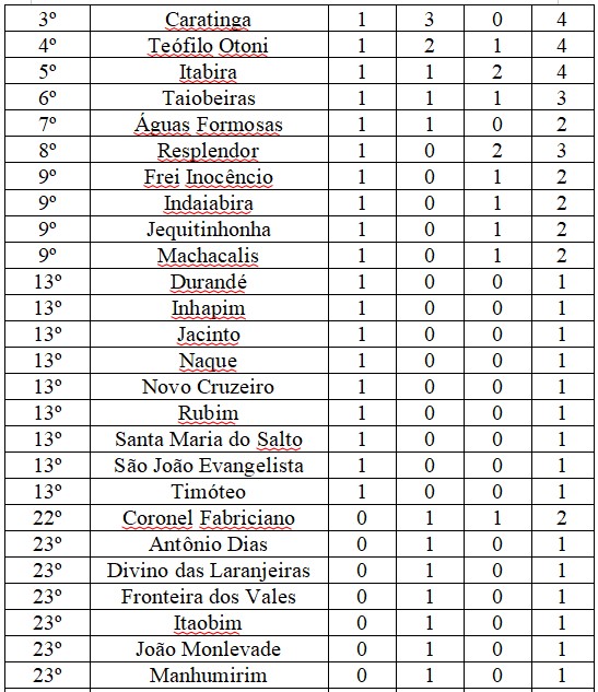 Esta foi a melhor participação da história de Caratinga em uma etapa regional. No quadro de medalhas é o terceiro município em relação às medalhas conquistadas. Os medalhistas foram Ouro – Vôlei de Praia Masculino Módulo 1- Escola Estadual Princesa Isabel; Prata – Xadrez Masculino Módulo 2- E.E. Feliciano Miguel Abdalla e Prata – Voleibol Masculino e Feminino Modulo 2- Escola Professor Jairo Grossi.