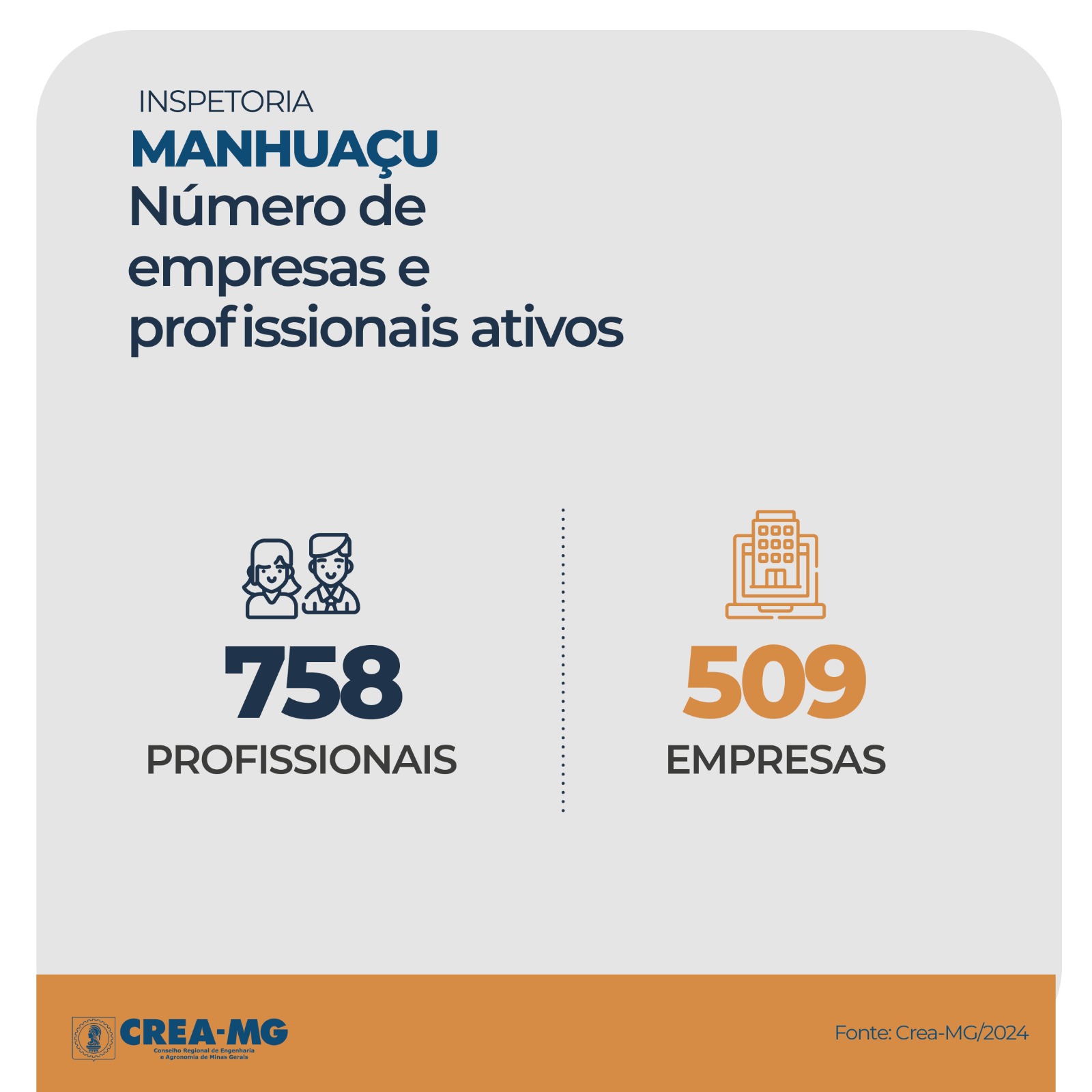 O Crea-MG verifica e fiscaliza o exercício e a atividade profissional da engenharia, da agronomia, da geologia, da geografia e da meteorologia, amparado pela Lei Federal 5.194/1966. A função do Conselho é defender a sociedade da prática ilegal das atividades técnicas, exigindo a participação declarada de profissionais legalmente habilitados, com conhecimento e atribuições específicas, na condução dos empreendimentos nestas áreas. Hoje, o Crea-MG possui mais de 150 mil profissionais registrados e quase 60 mil empresas com registro ativo.