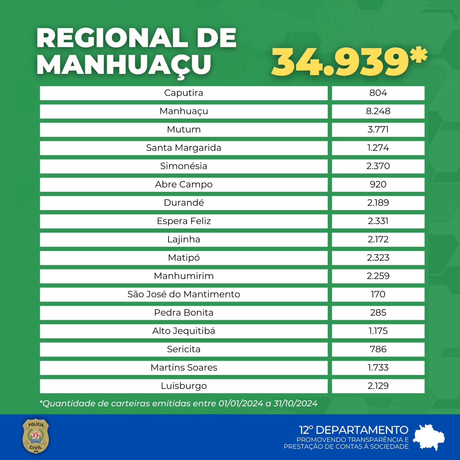 Em todo o 12º Departamento de Polícia, foram emitidas 159.296 identidades no novo modelo, distribuídas da seguinte forma pelas regionais (considerando todas as cidades abrangidas por essas regionais):