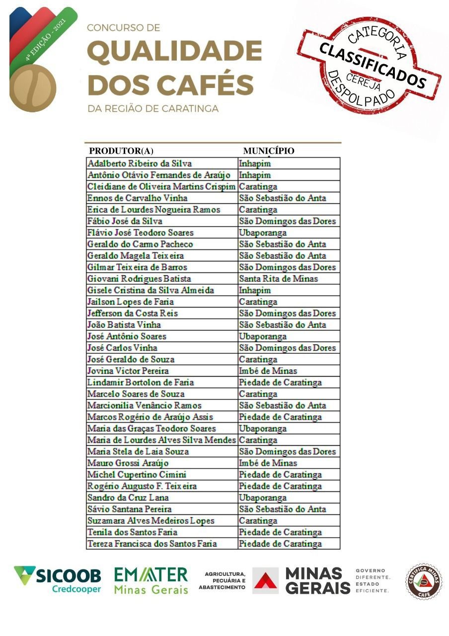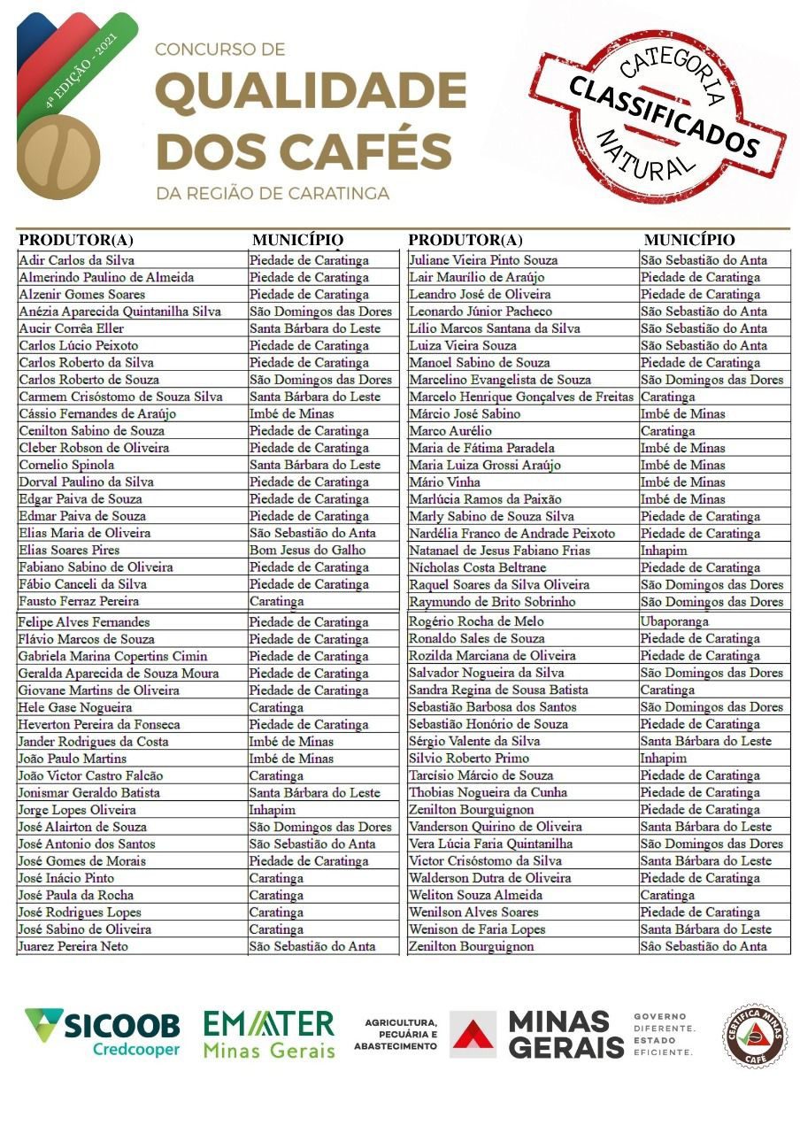 CARATINGA- A Empresa de Assistência Técnica e Extensão Rural do Estado de Minas Gerais (Emater), em parceria com o Sicoob Credcooper, Secretaria de Agricultura, Pecuária e Abastecimento e o Certifica Minas Café, divulga a lista dos finalistas do Concurso de Qualidade dos Cafés da Região de Caratinga, nas categorias natural e cereja despolpado.