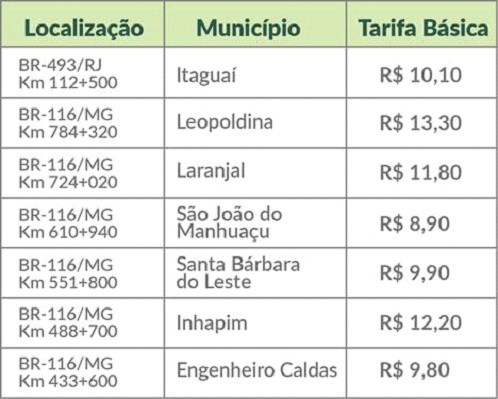 DA REDAÇÃO – A EcoRioMinas, concessionária responsável pela administração dos 726,9 km de concessão das BR-116/RJ e MG, BR-493/RJ e BR-465/RJ, informa que a partir da 0h do dia 27 de outubro, conforme deliberação nº 352, publicada no Diário Oficial da União de 16 de outubro de 2023, a Diretoria Colegiada da Agência Nacional de Transportes Terrestres – ANTT, autorizou o início da cobrança da tarifa nas praças de pedágio de Itaguaí na BR-493/RJ, km 112+500, e na BR-116/MG, nos municípios de Leopoldina – km 784+320, Laranjal – 724+020, São João do Manhuaçu – km 610+940, Santa Bárbara do Leste – km 551+800, Inhapim – km 488+700 e Engenheiro Caldas – km 433+600.