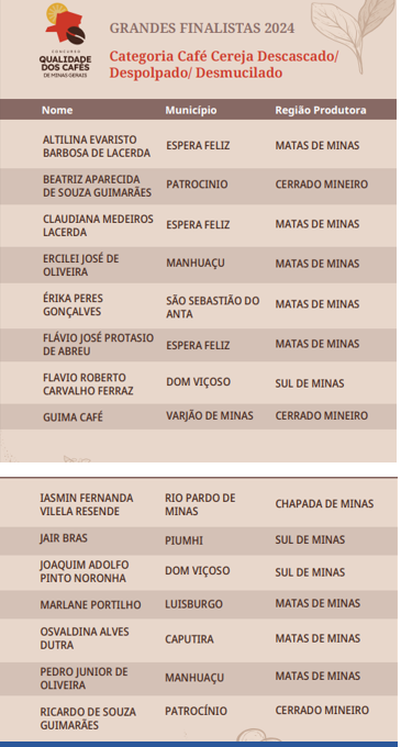 Na edição de 2024, a competição recebeu um total de 1.406 amostras concorrentes, provenientes de 146 municípios mineiros, das quatro macrorregiões produtoras do estado. A região das Matas de Minas foi a com maior número de inscritos (840), seguida do Sul de Minas (345), Cerrado Mineiro (151) e Chapada de Minas (70). Esta é a 21ª edição da competição. O concurso vai anunciar os vencedores estaduais das duas categorias, em cada macrorregião produtora, além do campeão estadual, com a maior nota entre todos os concorrentes. Também será destacada a cafeicultora que obtiver a melhor pontuação entre os finalistas e o cafeicultor participante do programa Certifica Minas Café que conseguir a melhor nota.