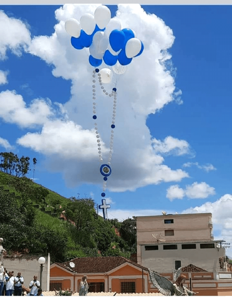 Após a missa, um grupo de fiéis lançou um terço azul e branco preso a balões de gás hélio que voaram pelo céu da cidade exibindo em sua medalha o ícone de Nossa Senhora do Rosário.
