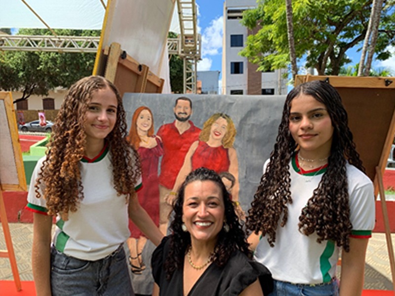 Entre as releituras, um trabalho especial comoveu a secretária Ludmilla Sales. Pintado por estudantes da Escola Municipal Manoel Floro Filho, no Córrego São José do Porto, o quadro a homenageia ao lado de sua família.
