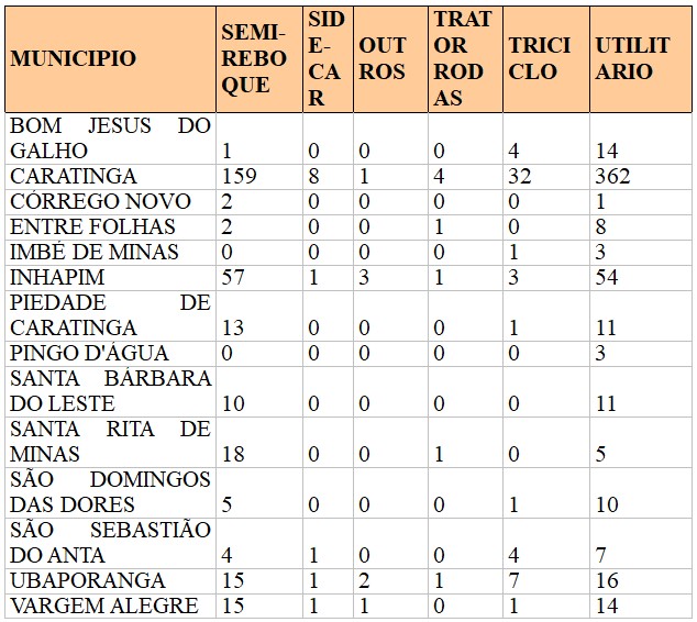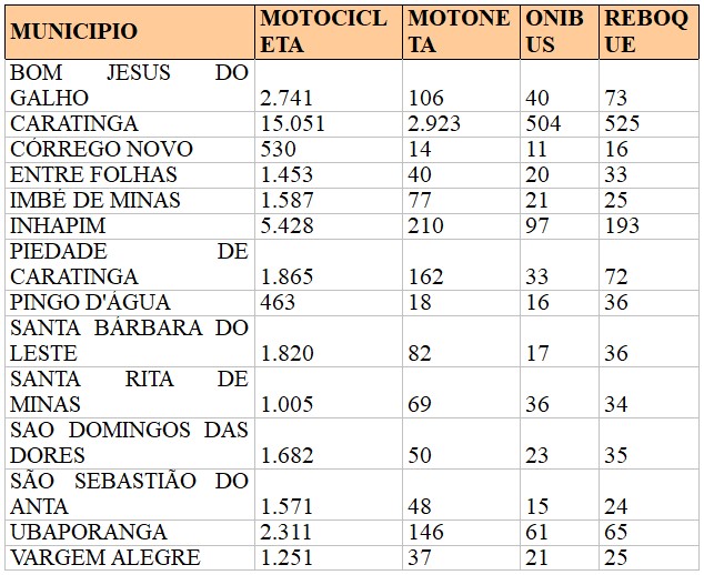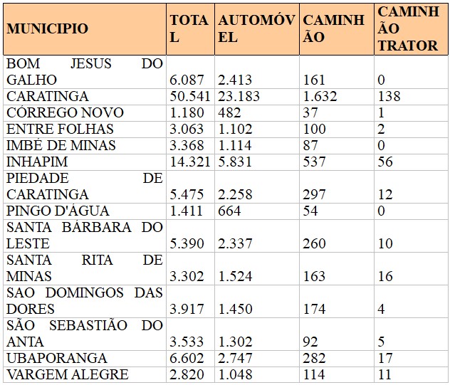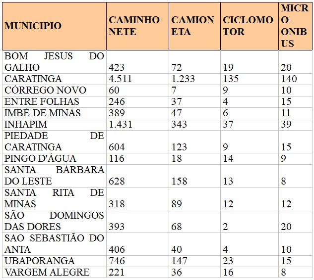 Bom Jesus do Galho, Córrego Novo, Entre Folhas, Imbé de Minas, São Domingos das Dores, São Sebastião do Anta e Vargem Alegre contabilizam um número de motocicletas superior ao de automóveis.