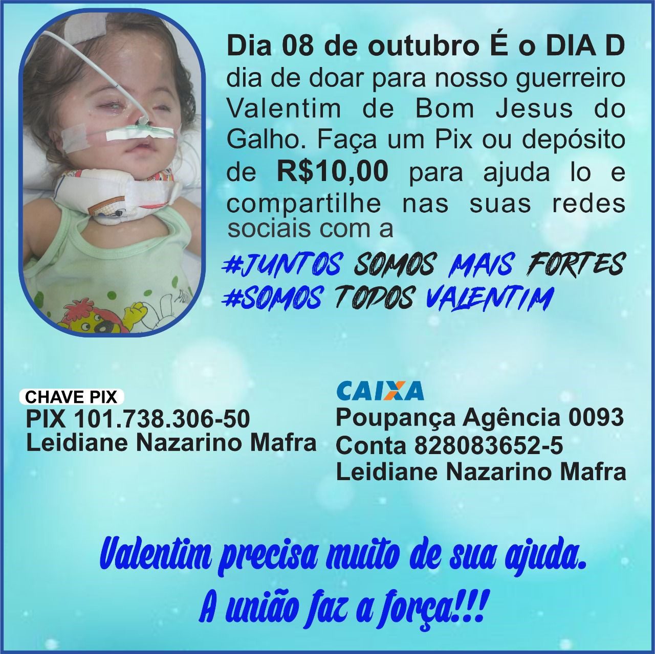 Embora com tenra idade, Valentim Sebastian Mafra de Freitas, um ano e seis meses de vida, já coleciona vitórias: Portador de Síndrome de Down, já venceu a meningite, diversos quadros de infecção e luta contra a hidrocefilia não comunicante. Toda essa batalha é acompanhada de perto pelos pais Leidiane Nazarino Mafra e João Geraldo de Freitas.