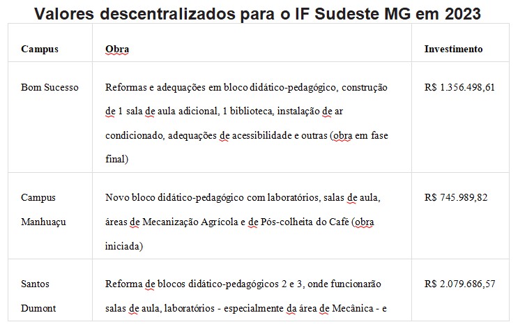 DA REDAÇÃO – O Instituto Federal do Sudeste de Minas Gerais (IF Sudeste MG) recebeu do Ministério da Educação (MEC) cerca de R$5,8 milhões, de 2023 a junho de 2024, para investimento em obras de infraestrutura nos campi Bom Sucesso, Manhuaçu, Santos Dumont e São João del-Rei. Os recursos integram a ação de consolidação do Novo Plano de Aceleração de Crescimento (Novo PAC) do governo federal.
