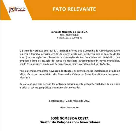 INHAPIM – Na tarde desta última quarta-feira (23), o prefeito Márcio Elias, o “Marcinho” deu uma ótima notícia para comunidade inhapinhense e toda a região. O chefe do poder executivo de Inhapim anunciou a conquista de uma agência do Banco do Nordeste do Brasil – BNB. “No final do ano de 2021 mobilizamos nosso município de Inhapim, realizando um grande encontro com representantes do Banco do Nordeste e diversos outros municípios da nossa região, demonstramos não somente a nossa pretensão, mas principalmente a viabilidade geográfica e econômica da nossa Inhapim. Em seguida estivemos em Brasília junto com o deputado federal Mauro Lopes protocolando nossa intenção de termos em nossa cidade uma agência do Banco do Nordeste e hoje recebemos com muita satisfação a notícia que Inhapim, dentre os 84 novos municípios que passaram a compor a área do Sudene, será contemplado com uma nova agência do Banco do Nordeste. Glória e honra a Deus pelo nosso trabalho”, destacou o prefeito Marcinho.