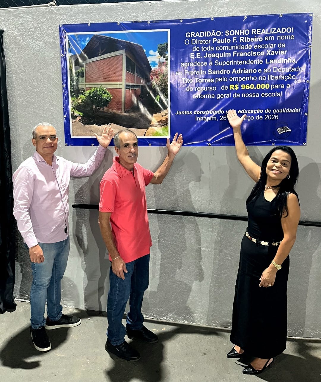 O prefeito Sandro Adriano esteve presente no bairro Santo Antônio, na sede da Escola Estadual Joaquim Francisco Xavier, para anunciar a conquista dos recursos e o início das obras. “É gratificante poder retornar aqui à comunidade do bairro Santo Antônio, local de que tanto gosto, para anunciar mais essa conquista: os recursos necessários para a reforma geral do prédio da Escola Estadual Joaquim Francisco Xavier. Desde quando o diretor Paulo nos procurou, apresentando essa demanda — a necessidade de reformar todo o prédio da escola —, assumimos o compromisso de levá-la ao nosso deputado estadual Tito Torres, que prontamente nos atendeu e, por meio da Secretaria de Estado de Educação, alocou os recursos necessários para a realização desta obra.”