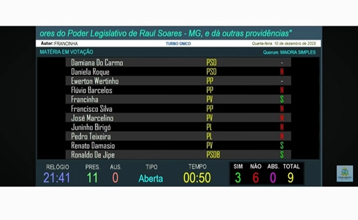 RAUL SOARES – Em sessão marcada por debates na noite desta quarta-feira (10), a Câmara Municipal de Raul Soares rejeitou, por 7 votos a 3, o parecer contrário ao Projeto de Lei nº 59/2025, que cria um vale-alimentação mensal de R$ 1.518 para os vereadores do município.