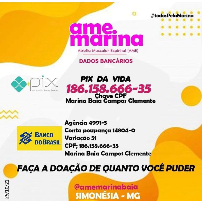 Quem quiser contribuir com a campanha e ajudar Marina a continuar sorrindo, basta fazer depósito na conta poupança em nome de Marina Baia Campos Clemente. Os dados são os seguintes: Banco do Brasil, agência 4991-3, conta poupança 14804-0, variação 51, CPF 186.158.666.35. Quem preferir, pode usar o PIX (Chave CPF 18615866635).
