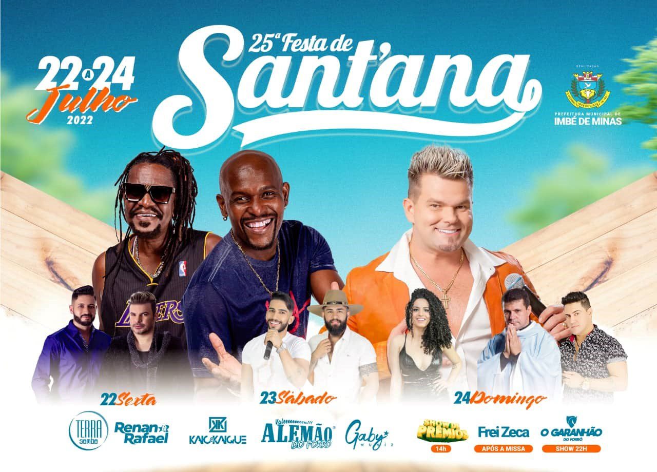 IMBÉ DE MINAS – A Prefeitura Municipal de Imbé de Minas divulgou, no último domingo (19), pelas redes sociais, a programação da mais tradicional comemoração da cidade. Nos dias 22 a 24 de julho, será realizada a 25ª Festa de Sant’Ana, a partir das 20h, na Praça Manoel Joaquim Teodoro. No domingo, a festa começa à tarde.