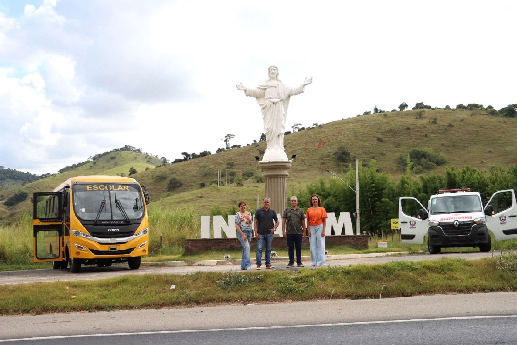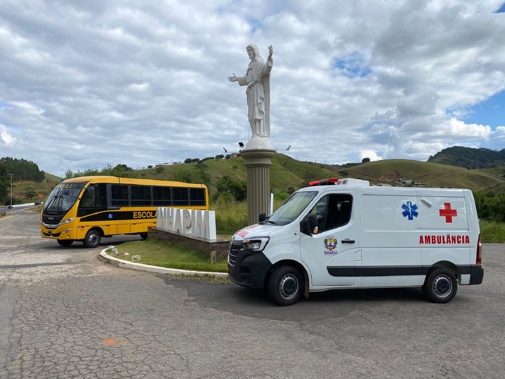 O vice-prefeito Sandro Adriano, o “Sandro da Saúde”, também esteve presente na entrega dos dois veículos que ocorreu na rotatória do monumento “Cristo Acolhedor”, construído pela administração municipal às margens da rodovia BR-116, acompanhado da secretária de saúde Ana Elza Silva Araújo e da secretária de educação Carla Ervilha Silva Araújo. “Estamos aqui em nosso mais novo cartão postal de Inhapim, monumento “Cristo Acolhedor”, ao lado da secretária de educação Carla Ervilha, ao lado da secretária de saúde Ana Elza trazendo duas boas notícias para o povo inhapinhense, a aquisição de mais um ônibus escolar, meio de transporte para possibilitar aos nossos estudantes chegar até a escola ou a faculdade, espaços de fonte de conhecimento, e uma ambulância para o atendimento nos primeiros socorros de nossa população de Inhapim. Reforço nosso compromisso diário com nossos munícipes na construção de uma cidade ainda melhor, sempre pesando em todos os pontos, seja na saúde ou educação”.