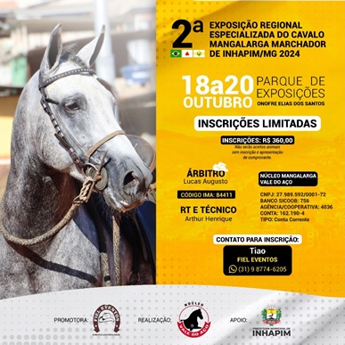 INHAPIM – A Associação Brasileira dos Criadores do Cavalo Mangalarga Marchador Núcleo Vale do Aço – ABCCMM Núcleo Vale do Aço e a Fiel Eventos Agropecuários realizarão no Parque de Exposições Onofre Elias dos Santos entre os dias 18 a 20 de outubro, a 2ª Exposição Regional Especializada do Cavalo Mangalarga Marchador de Inhapim.