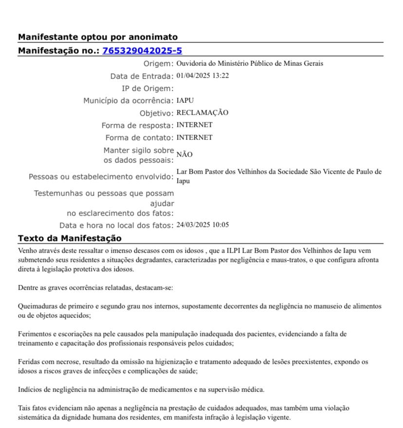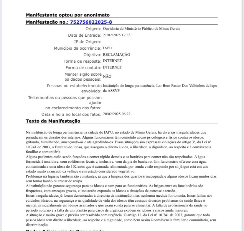 IAPU- Um lar de acolhimento para idosos, em Iapu, no centro, é alvo de denúncias de maus tratos e negligência. Os relatos chegaram à Ouvidoria do Ministério Público de Minas Gerais, por meio da Promotoria de Inhapim, que apura o caso. O espaço conta com 31 internos.