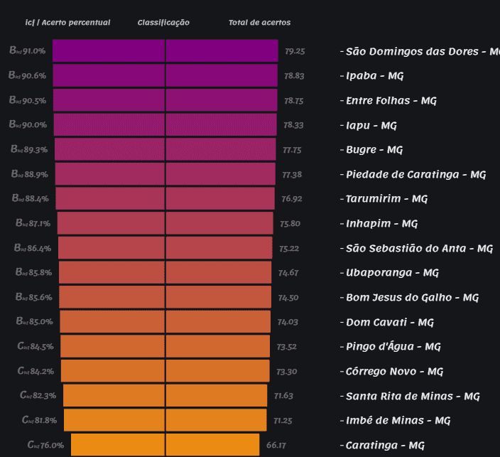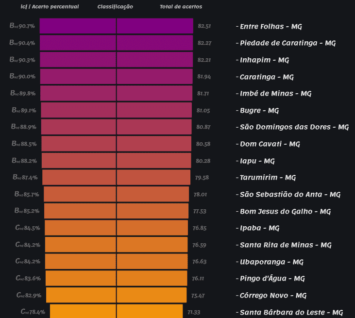 Na análise da microrregião de Caratinga, o ranking 2022 apresenta Entre Folhas com o melhor resultado, seguido por Piedade de Caratinga, Inhapim e Caratinga. Vargem Alegre e São João do Oriente tiveram os menores resultados com pontuação D.