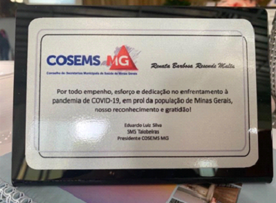 COSEMS/MG entrega placa para secretária de Saúde de Entre Folhas pela condução dos trabalhos de enfrentamento à pandemia de Covid-19