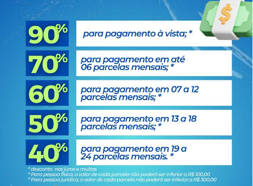 – Entre 19 e 24 parcelas, desconto de 40% dos valores de multas e juros.