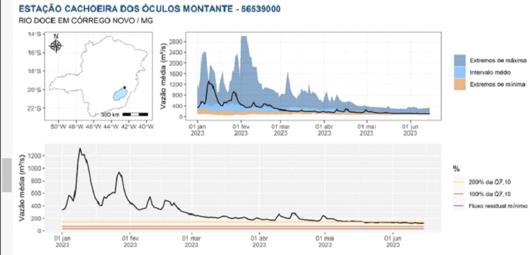 Durante o período de janeiro a junho de 2023, foram observadas oscilações nas vazões em algumas estações, dentre elas a “Cachoeira dos Óculos”, afluente do Rio Doce em Córrego Novo, que apresentou vazões oscilando entre o intervalo de mínimas e a faixa normal entre março e abril, e posteriormente ficou dentro do esperado. Por outro lado, as estações Naque Velho e São Pedro do Suaçuí mantiveram-se dentro do intervalo de extremos de mínima a partir de março, e a estação Mário de Carvalho (Rio Piracicaba, em Timóteo) registrou vazões abaixo do esperado a partir de fevereiro.