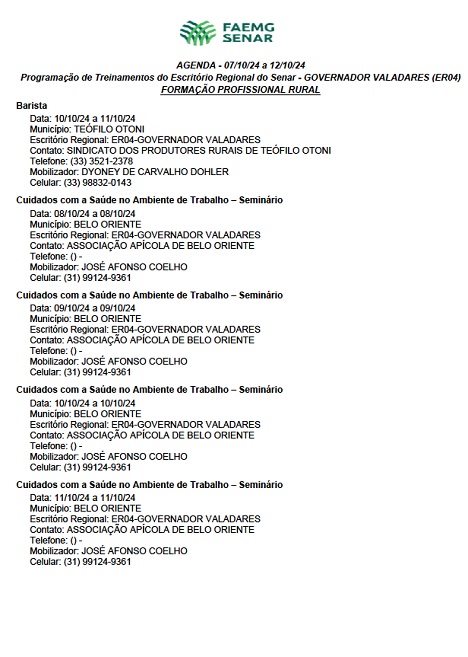 O Sistema Faemg Senar, em parceria com os Sindicatos dos Produtores Rurais e outras entidades cooperadas, promoverá uma série de cursos gratuitos de Formação Profissional Rural (FPR) e Promoção Social (PS) em diversos municípios dos Vales do Aço, Rio Doce, Mucuri e Jequitinhonha. As capacitações, que serão realizadas entre os dias 7 e 12 de outubro, têm como objetivo fortalecer o setor agropecuário e promover o desenvolvimento social no campo, proporcionando aos participantes a oportunidade de adquirir novas habilidades e ampliar a visão empreendedora.