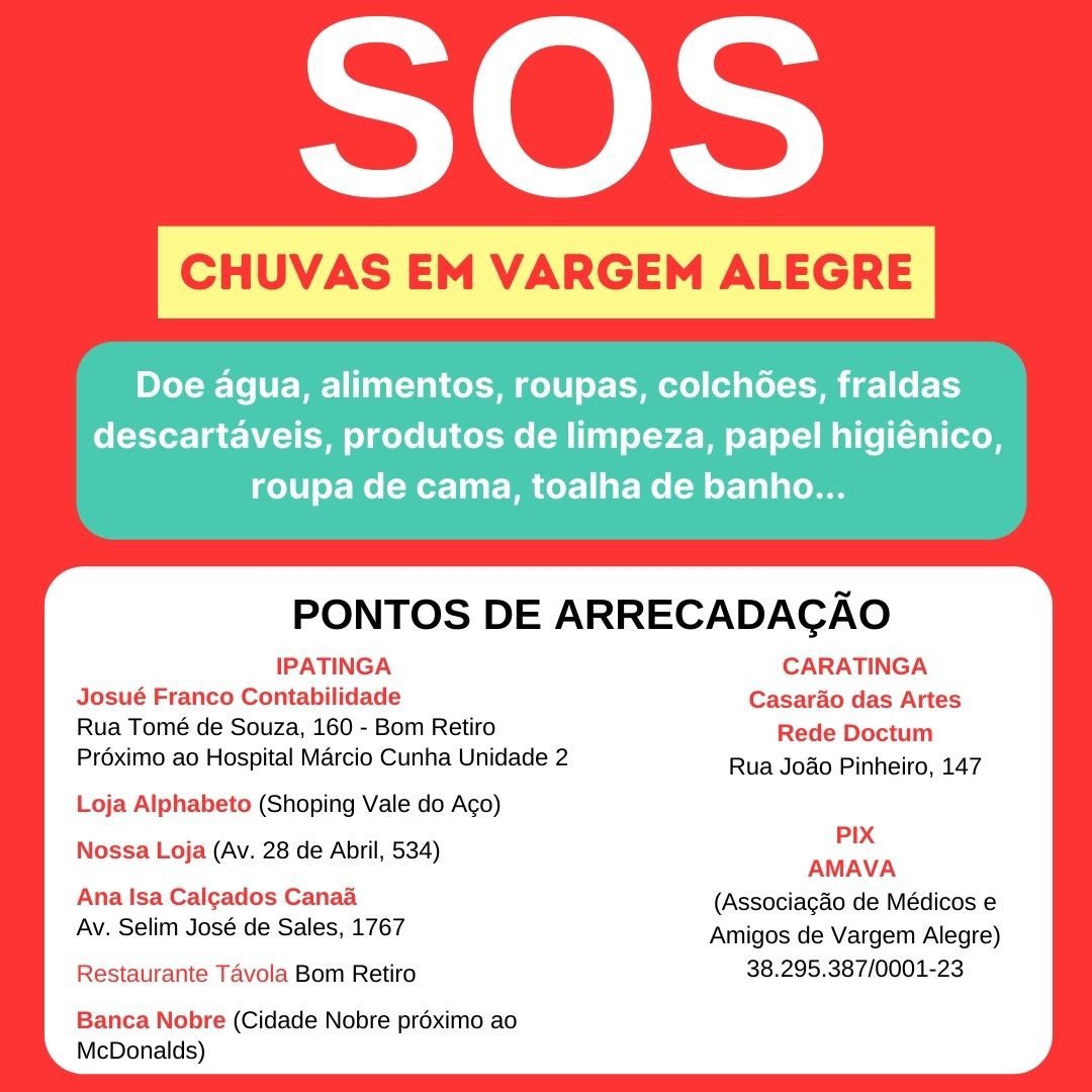 A respeito dos pontos de coleta, a Rede Doctum é um deles em Caratinga. “Casarão das Artes também. Em Ipatinga também tem um ponto de coleta, que é no bairro Bom Retiro, próximo a Unidade II do hospital Márcio Cunha. Tem também o número do Pix da Associação de Médicos de Vargem Alegre. Essas doações serão canalizadas na compra de remédios, colchões. Tomara que não, mas podem acontecer casos de doenças de pele, leptospirose. Também precisamos de produtos de limpeza, como água sanitária e detergente”, conclui Marlise, solicitando mais uma vez que quem puder, que faça sua doação.