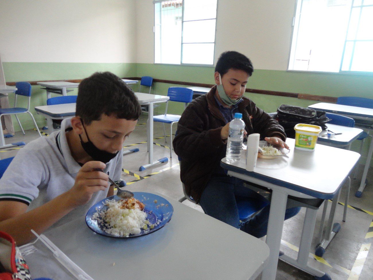 A hora do recreio foi adaptada. Para maior segurança, as refeições são feitas em sala de aula. Uma das auxiliares de serviço de educação básica leva e busca o prato de cada aluno.